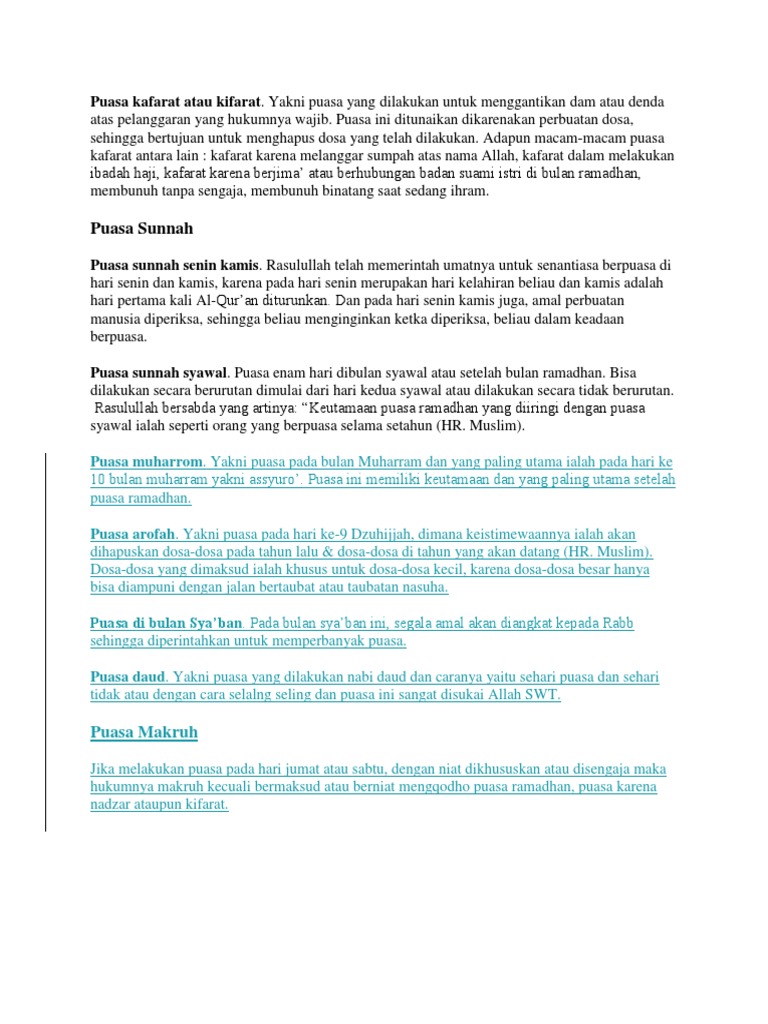 Puasa makruh yang terdiri dari puasa yang dikhususkan pada hari jumat dan sabtu. Puasa wajib yang terdiri dari. Perihal kafarat ini Allah telah menjelaskannya dalam Al-Quran Allah tidak menghukum kamu disebabkan sumpah-sumpahmu yang tidak dimaksud untuk bersumpah tetapi Dia menghukum kamu disebabkan sumpah-sumpah yang kamu sengaja maka kaffarat melanggar sumpah itu ialah memberi makan sepuluh orang miskin yaitu dari makanan yang biasa kamu.